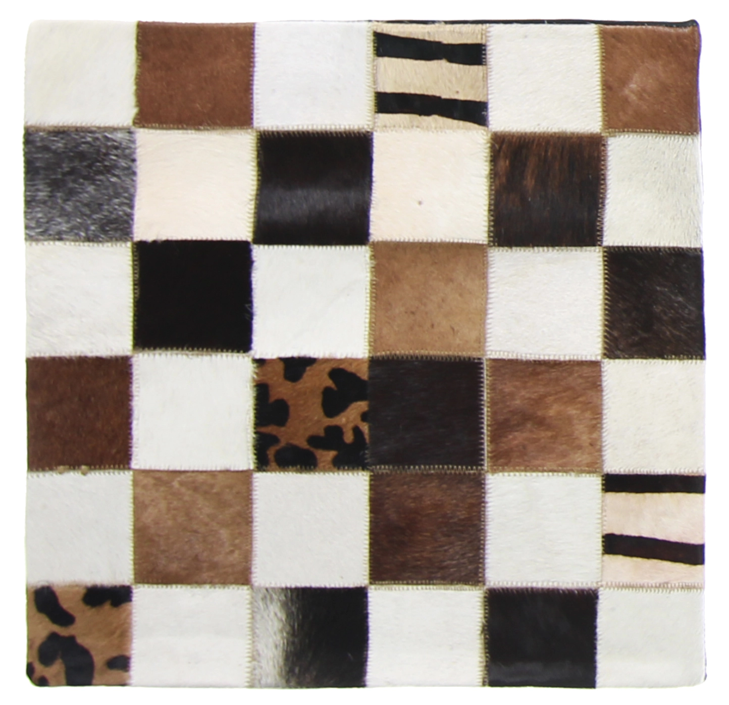 Aidosta lehmännahasta valmistettu tyyny. Saatavilla on ruskeavalkoisia, mustavalkoisia ja tilkkukuviollisia tyynyjä.