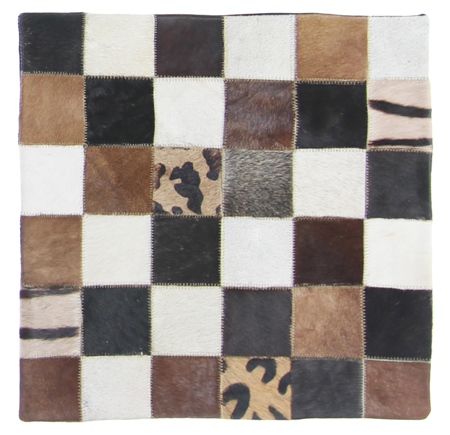 Aidosta lehmännahasta valmistettu tyyny. Saatavilla on ruskeavalkoisia, mustavalkoisia ja tilkkukuviollisia tyynyjä.