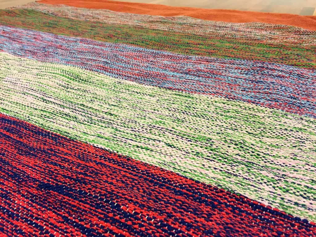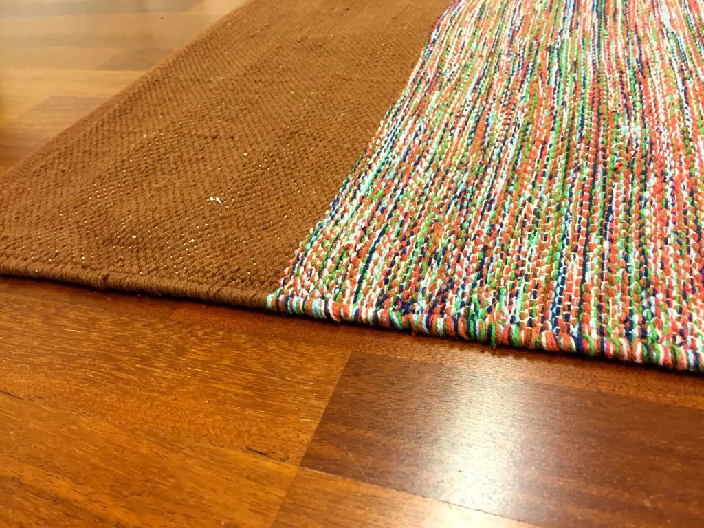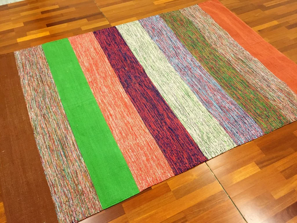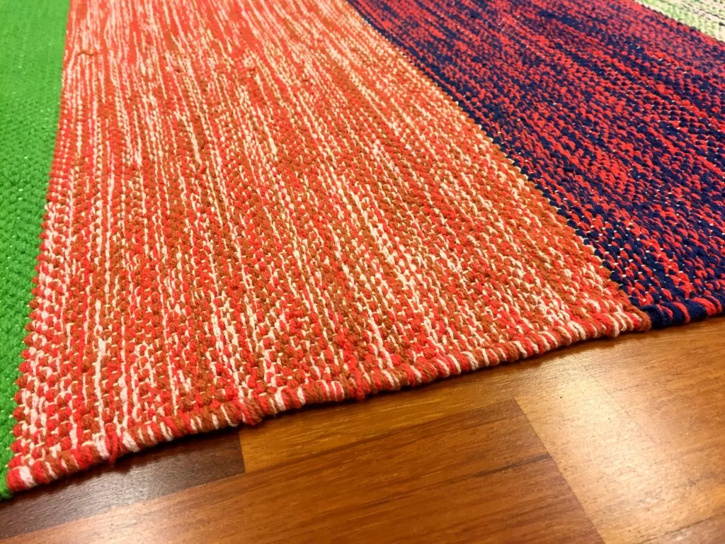 Käsin kudottu räsymatto 100 % puuvillaa.