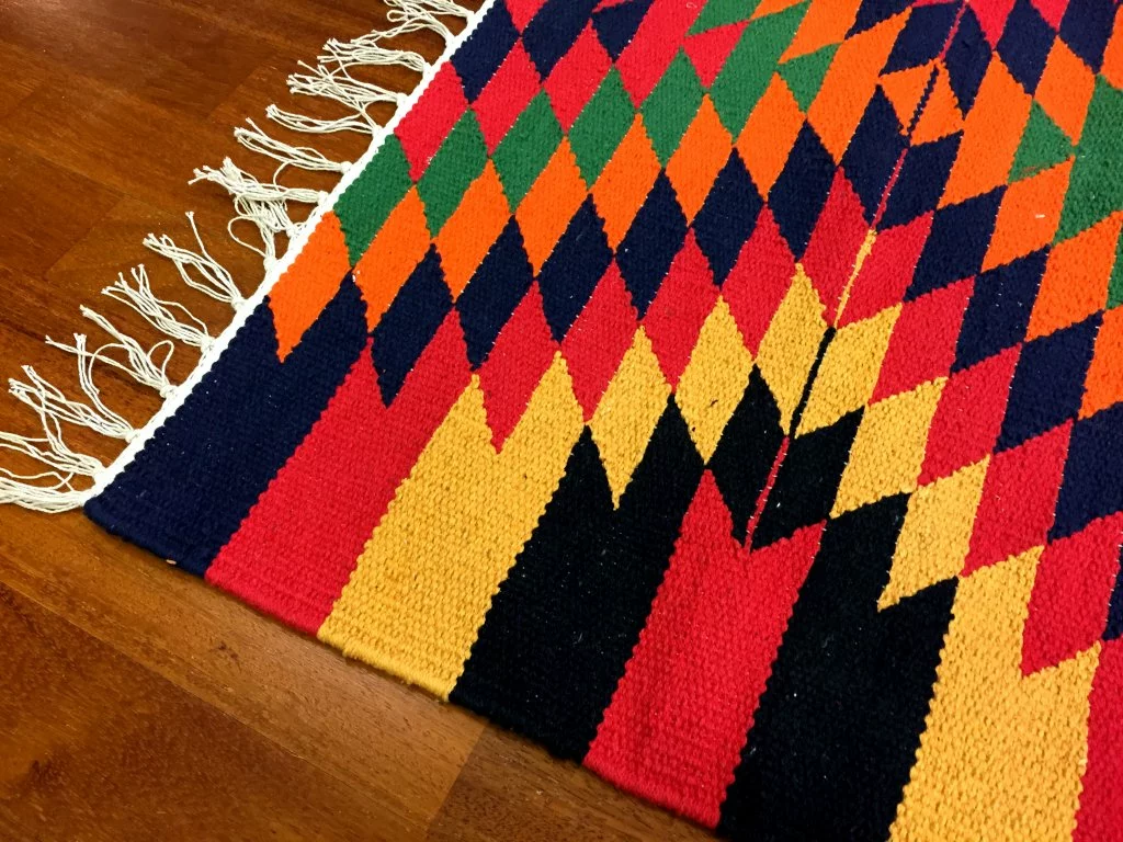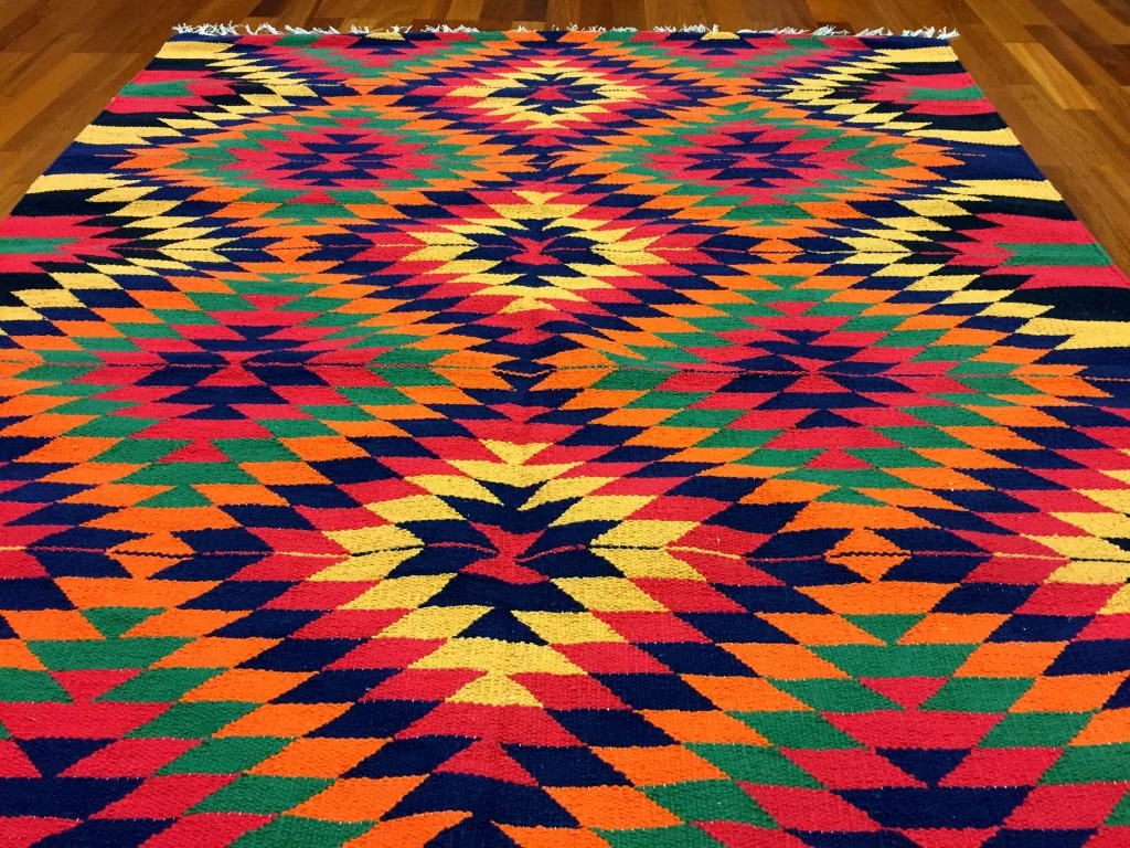 Käsin kudottu räsymatto 100 % puuvillaa.