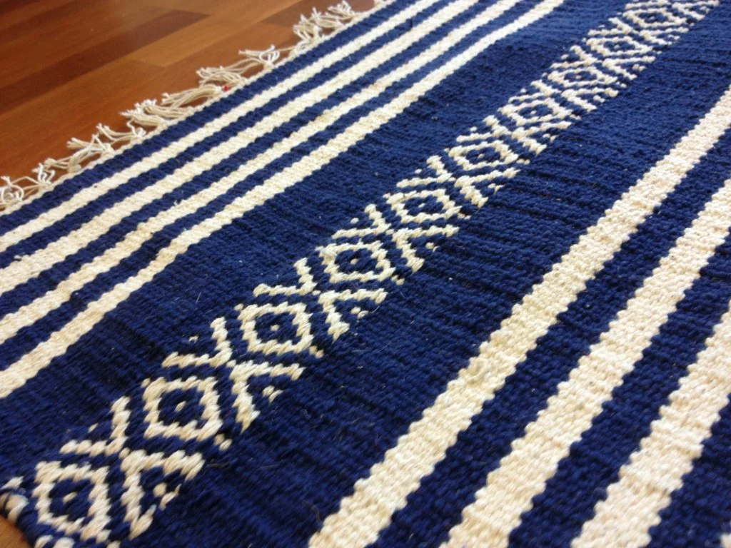 Käsin kudottu räsymatto 100 % puuvillaa.
